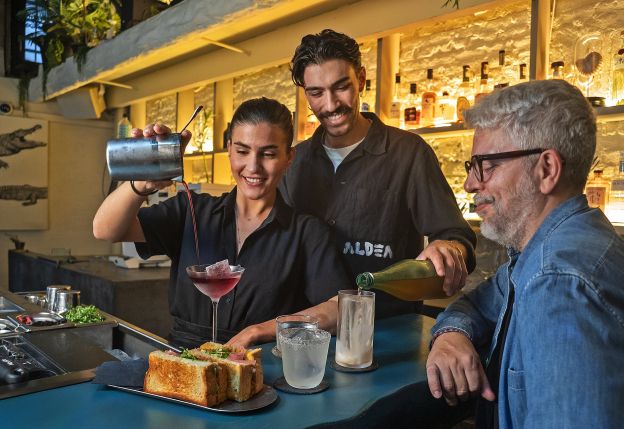 Amb vuit mesos de vida, Aldea ja ha aconseguit cridar l’atenció dels amants de la cocteleria. En una Barcelona saturada de propostes innovadores, cal tenir veu pròpia i un discurs amb cara i ulls. I això ho saben molt bé els bàrmans Francesco Falco i Silvia Dorninger, els pares de la idea. La parella ha volgut xopar el bar amb la mística dels cenotes mexicans. Una combinació de plantes, fusta i pedra et posa en situació, però la jugada mestra la trobo a la barra, una L blavosa que sem