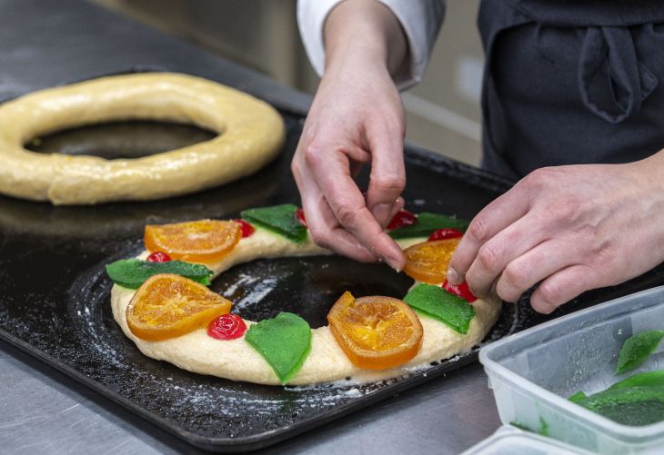 El roscón de Reyes de pastelería también se distingue por utilizar ingredientes naturales y de calidad: masa madre, harina, huevos frescos, mantequilla, almendra marcona (para el mazapán) y una pieza fundamental: fruta auténtica. Sobre este último punto, desde el Gremio señala que el roscillo artesano se decora con naranja, cerezas y láminas de melón (la fruta verde del roscón) e invita a todos a no sacarla. Se trata de fruta que se confita hirviéndola con agua y azúcar, lo que hace que pierda su color. Por eso los pasteleros la tiñen con colorante natural.