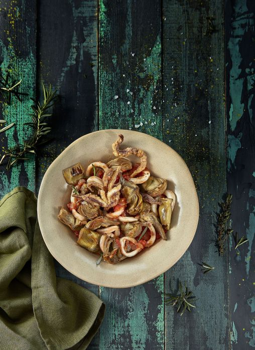 Corazones de alcachofa confitados con calamares