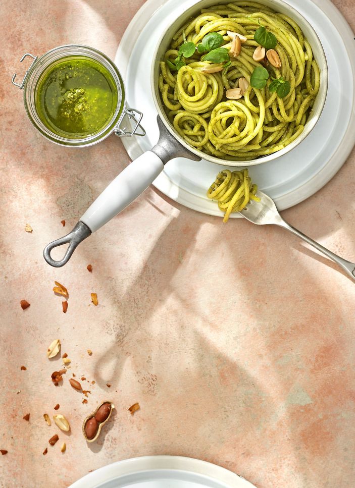 Espaguetis con pesto de cacahuetes y poleo