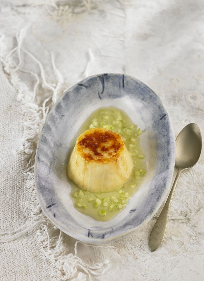 - En un plat fondo, serviu la crema desemmotllada, escampeu-hi sucre per sobre i caramel·litzeu-la amb un cremador. Decoreu-la amb la salsa de poma verda.