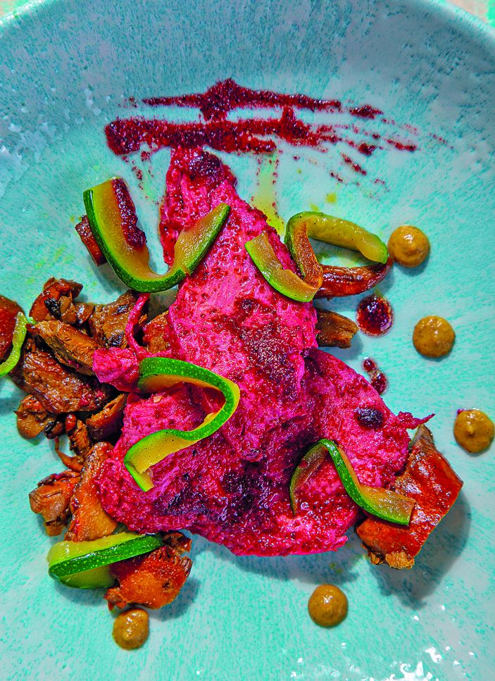 - Tritureu la salsa de coco i remolatxa amb els sucs de cocció del pollastre i l’altra meitat de remolatxa. Macereu-hi el pollastre uns minuts i serviu-ho.