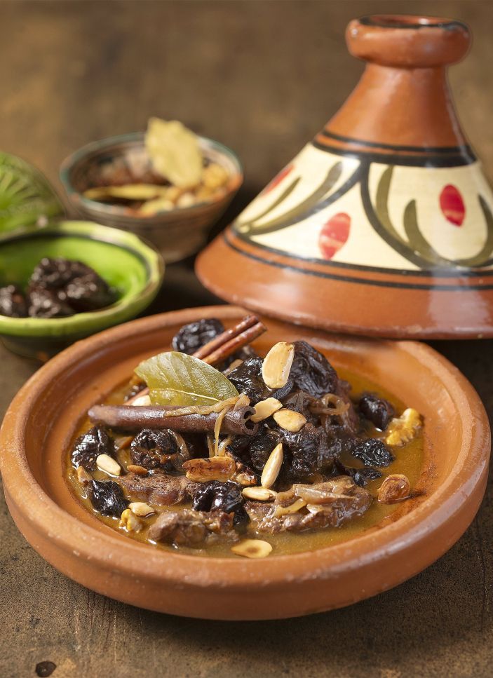 - Cobriu la carn amb les prunes i la mel i coeu-la 15 min més. Retireu-la del foc i decoreu el tagín amb nous i una mica de julivert picat.